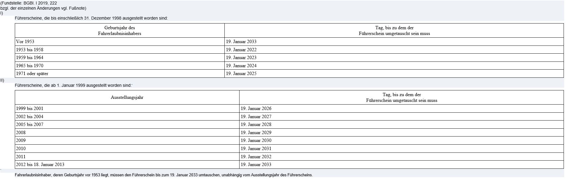 Der Kreis Ostholstein gibt folgende Übersicht, wann welche Führerschein getauscht werden müssen, zur Kenntnis: